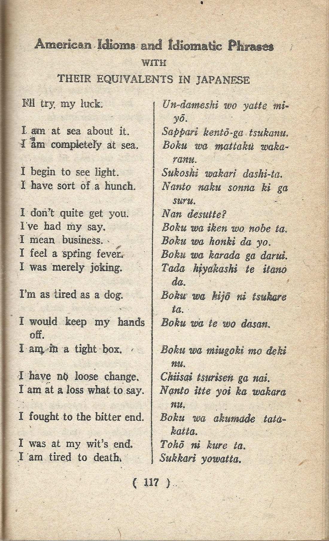 It makes a strong case for gathering our courage and going for those more interpretive translations, for example ‘I begin to see the light’ being translated into the archaic but simple ‘sukoshi wakari dashi-ta’ (sic), or ‘I am tired to death’ becoming the much less fatal ‘sukkari yowatta’ (see page 117 below).